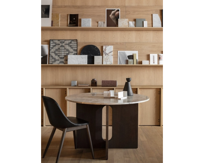 Как и великолепный монумент, обеденный стол Андрогин сочетает в себе поразительные природные материалы. Развивая коллекцию дальше, смелый, уверенный взгляд на обеденный стол усиливает силуэт бокового стола коллекции до более грандиозных пропорций. Стол не для слабонервных, он делает характерный акцент в любом месте - от домашней столовой до ресторана или другого места сбора. Натуральный или темно окрашенный дуб и каменная столешница Kunis Breccia, последняя из которых доступна только в Ø120, а базовые варианты создают смелые комбинации, дополняющие или контрастирующие по текстуре и отделке.