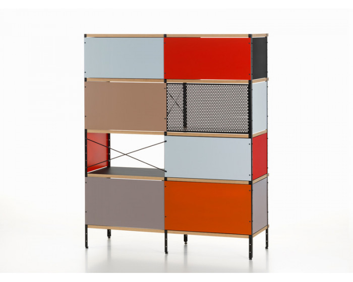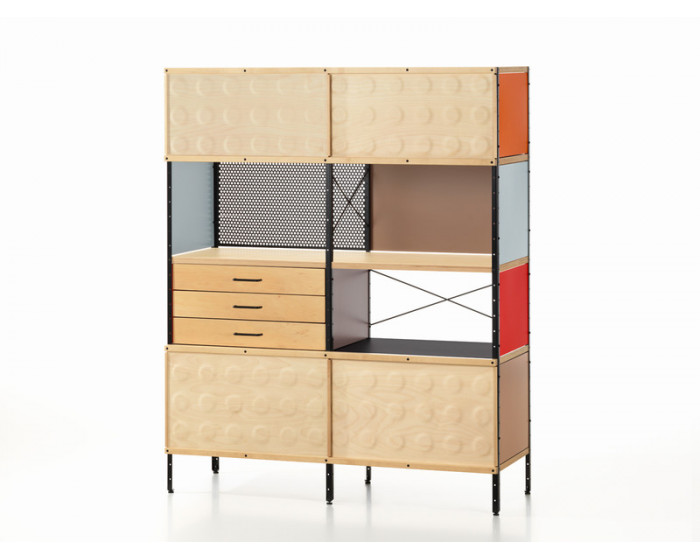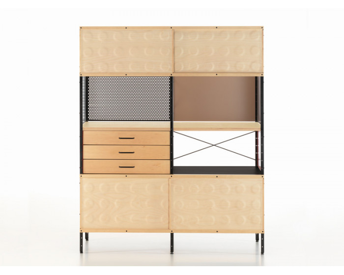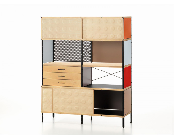 В сотрудничестве с офисом Eames и голландским дизайнером Хеллой Йонгериус была выбрана тщательно продуманная новая цветовая схема, чтобы придать ESU свежий и современный вид, сохранив при этом дух 1940-х и 50-х годов. Придерживаясь тех же принципов промышленного производства, что и одновременно построенный Eames House в кампусе Vitra, книжный шкаф ESU имеет четыре уровня полок, которые соответствуют высоте стандартных папок-переплетов. Он оснащен ящиками и раздвижными дверцами, что дает достаточно места для хранения вещей.
