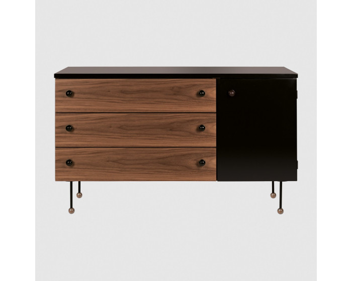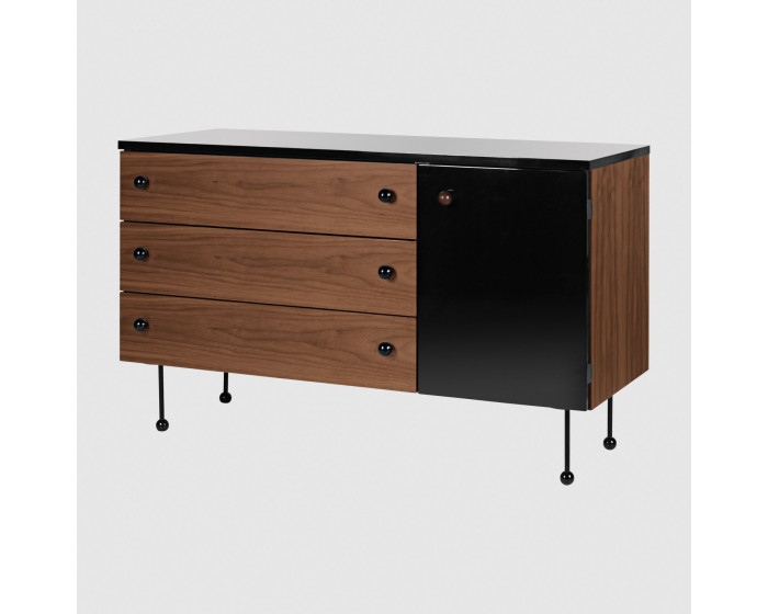 Тонкие металлические ножки с шаровидными ножками, характерная черта Гроссмана, контрастируют с острой прямоугольной формой из роскошного американского ореха, придавая мебели характерный вид легкости и, казалось бы, бросающей вызов силе тяжести. В дополнение к его элегантности, ящик имеет глубокую черную глянцевую поверхность на столешнице и небольшие деревянные шарики.
