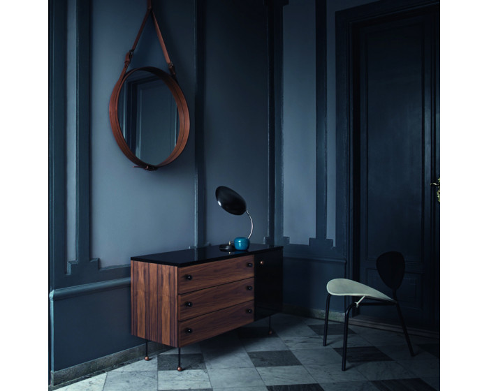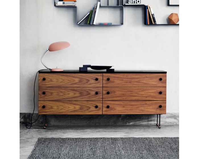 Тонкие металлические ножки с шариковыми ножками, характерная черта Гроссмана, контрастируют с острой прямоугольной формой роскошного американского ореха, придавая мебели характерный вид легкости и почти не поддающейся гравитации. В дополнение к своей элегантности, ящик снабжен глубоким, черным, глянцевым покрытием на столешнице и небольшими цельными деревянными сферами.