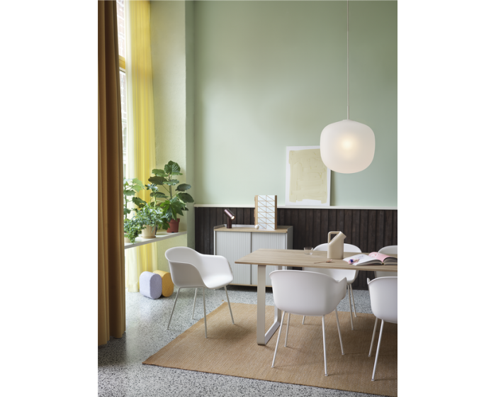 Корпус, полки и раздвижные двери из лакированной гнутой стали. Столешница и основание из массива дуба.