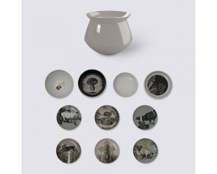 FAUX-SEMBLANTS многофункциональные блюда от Rachel & Benoît Convers, в этой коллекции идеально представлен баланс между дизайном и графикой. Так же в этой коллекции предложены объекты одиночные и множественные одновременно. Чистые Контуры сосудов делятся на множество различных блюд, предназначавшихся для столовых приборов. В очищенном виде вазы распадается на несколько контейнеров, предназначенных для посуды и раскрывает неожиданную графическую вселенную. «Разыграть использование для создания сюрприза, был вызовом этого проекта. Или как сделать полную таблицу с вазой ... " Rachel & Benoît Convers.