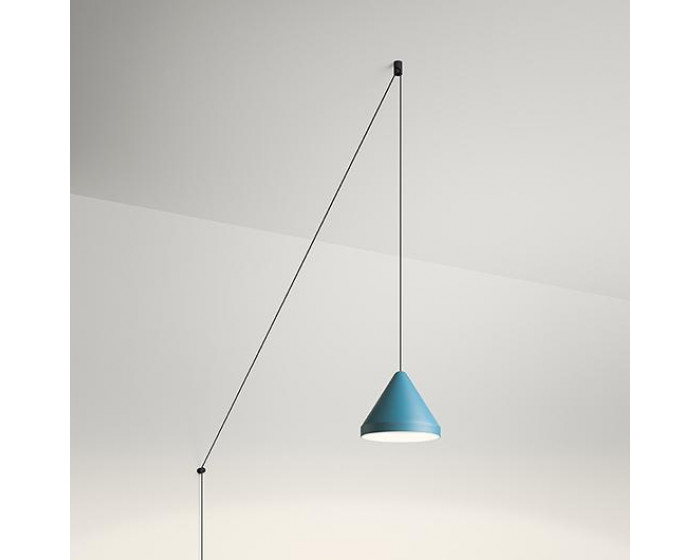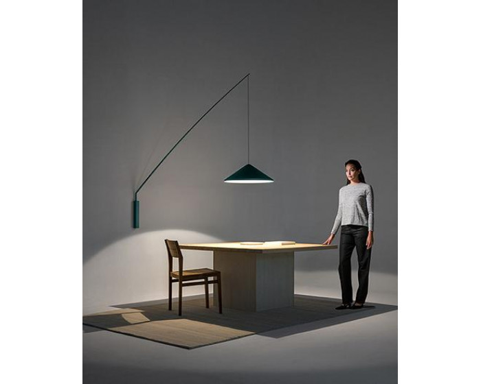 Настенный светильник. Дизайн Арика Леви. Из основания, прикрепленного к стене, поднимается стержень с плафоном. Электронная кнопка управления. Может быть подключен с вилкой или без нее. Светодиодный источник света.