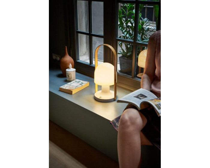 FollowMe Plus от Marset - это большая, перезаряжаемая и переносная настольная лампа, которая очаровывает своим приятным дизайном и освещает террасы, балконы и другие помещения без доступа к электрическим розеткам. Лампа FollowMe Plus, разработанная Инмой Бермудес, имеет изогнутую деревянную ручку, качающийся абажур и три уровня теплого светодиодного освещения. FollowMe поставляется с зарядным кабелем USB, уровень яркости которого можно регулировать с помощью медного переключателя питания, расположенного на основании. В 2016 году лампа FollowMe была отмечена престижной премией Red Dot Award.