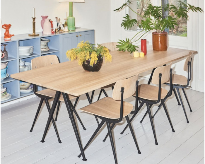 Разработанный, чтобы быть функциональным, легким и прочным, Стол Пирамиды имеет основу из стального листа с прямоугольной столешницей из дуба. Первоначально созданная Вимом Ритвельдом во время работы в Аренде в 1950-х годах, коллекция вырезов из стали была возобновлена компанией HAY вместе с Арендом. Стол поставляется в двух моделях - с навесом и без него - и подходит для использования в самых разных учебных заведениях, корпоративных средах и частных домах. Оба варианта доступны в различных вариантах отделки дерева и базовых цветов, которые можно согласовать с Result Chair.