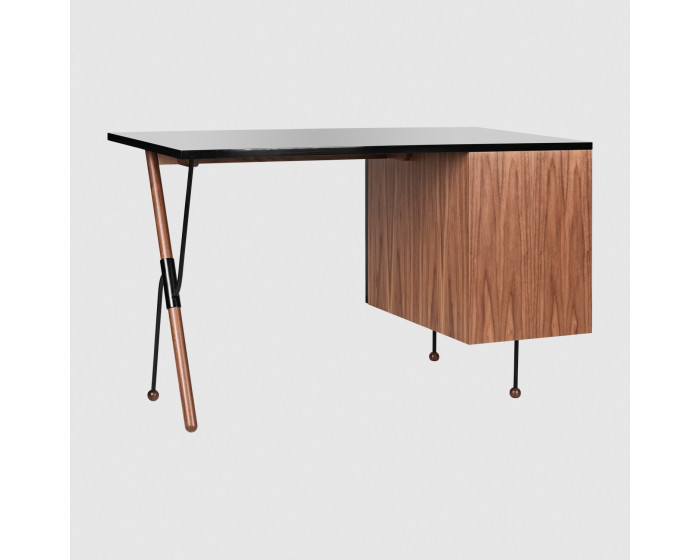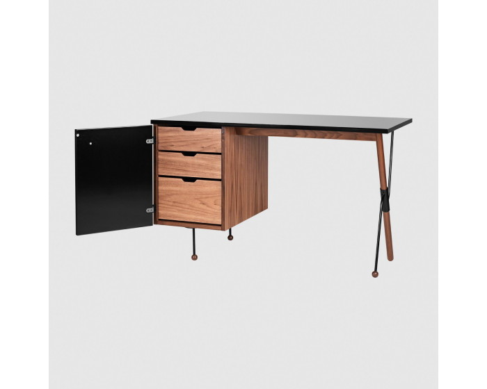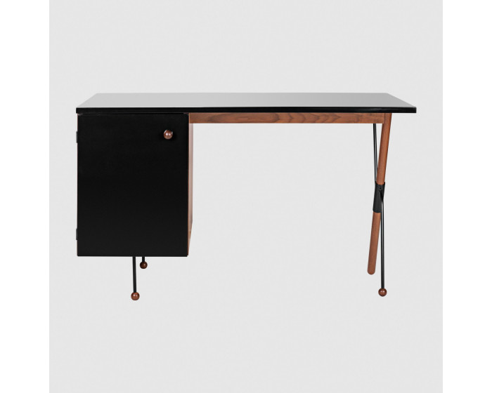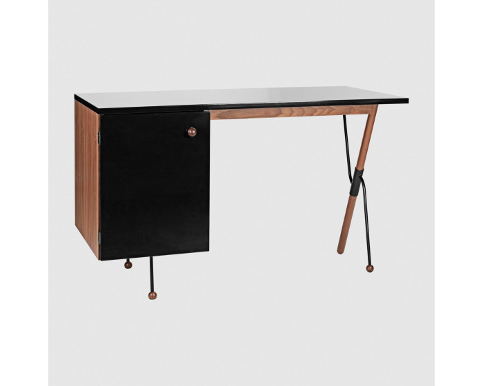 Его исключительная форма подчеркнута элегантным сочетанием материалов. Стол выполнен из американского ореха и имеет глубокую черную глянцевую поверхность на столешнице и дверце шкафа. На столе есть один левый шкаф, состоящий из двух низких ящиков и одного высокого ящика.