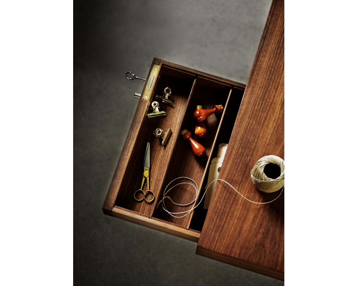 В письменном столе CH110 Вегнер демонстрирует другую сторону своего таланта в дизайне мебели, собирая столешницу, направляющие и два тонких ящика в один большой шпонированный элемент, опирающийся на две тонкие опорные ножки из плоской нержавеющей стали. Ящики оснащены изящными ручками из нержавеющей стали с характерными деталями, выполненными в форме ласточкиного хвоста. Каждый из них практически разделен одним, оборудованным небольшим лотком с закругленным дном, предназначенным для хранения мелких ценных вещей. Стол CH110 был создан в 1970 году как часть серии CH100 компании Wegner, которая была перезапущена в 2008 году в честь 100-летия Carl Hansen & Søn.