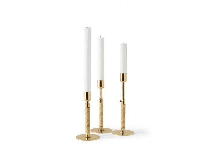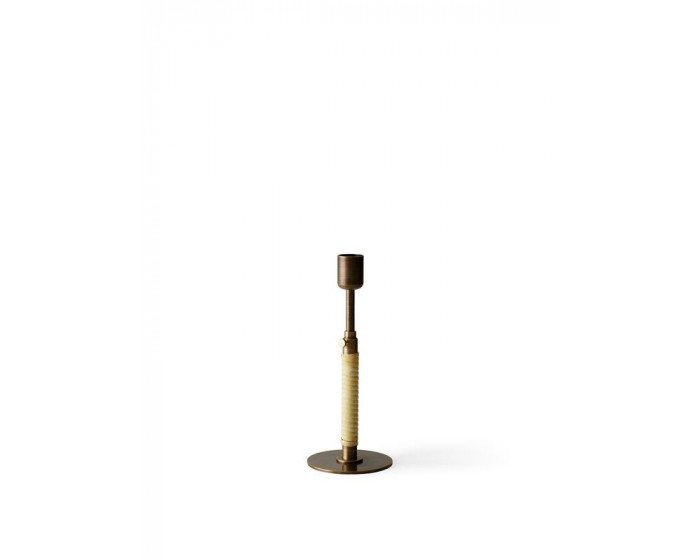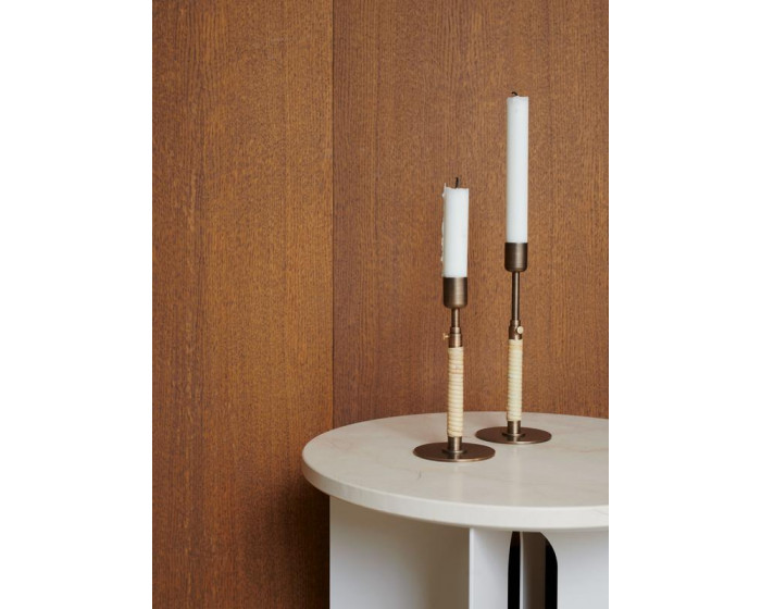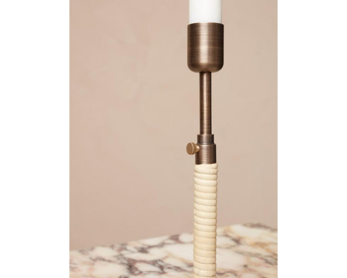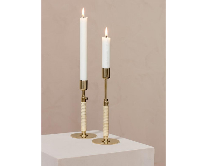 Подсвечник Duca, установленный на круглой основе и ножке из полированной или бронзовой цельной латуни, украшен ротангом вокруг ножки. Небольшой винт на боковой стороне конструкции позволяет пользователю регулировать высоту - удлиняя или укорачивая.