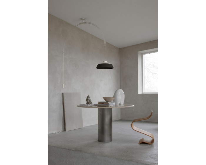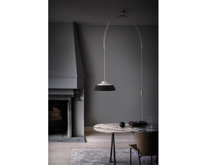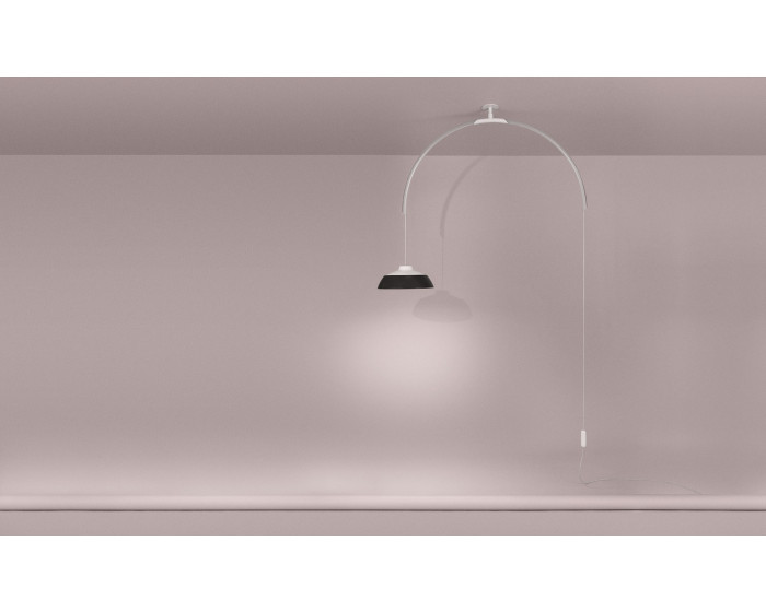 Интимный свет, создаваемый моделью 2129, окутывает пространство теплой атмосферой. Светильник оснащен незаметным противовесом и большим дугообразным кронштейном из прозрачного метакрилата, который крепится к потолку и может поворачиваться на 360 градусов по горизонтали. Чашечкообразный отражатель состоит из двух токарных алюминиевых деталей, окрашенных в белый и черный цвета икры. Дюбель для крепления к потолку и противовес изготовлены из окрашенной латуни.