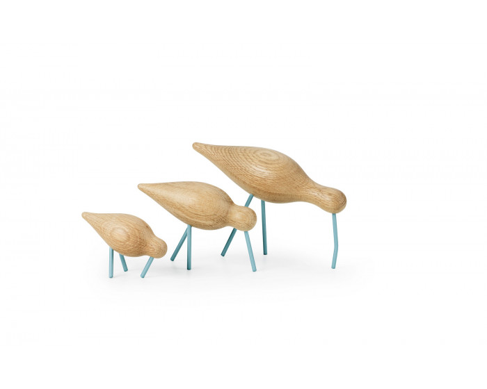 Исландский дизайнер Sigurjón Palssón создал целый ряд характерных деревянных птиц. Shorebirds изготовлены из твердого дуба, и их простой неприкрашенный силуэт дает им почти стилизованное выражение. В то же время большое внимание уделялось небольшим деталям, таким как изменения толщины тела, длина шеи и расположение ног и клюва. Это дает всем трем птицам свою уникальную индивидуальность и позволяет дизайну ожить. Крупнейшая из трех птиц вдохновлена кроншнепами, с длинной шеей и отличным вниз согнутым клювом. Это аристократическое существо. Его длинные ноги принимают медленные, продуманные шаги, осторожно оглядываясь. Птица среднего размера бодра и активна, как травник, или красноножка. Эта элегантная птица часто встречается в стаях болотных птиц. Наконец у нас есть третья самая маленькая птичка - кулик. Общительная маленькая птица, которую часто можно встретить в больших стаях.