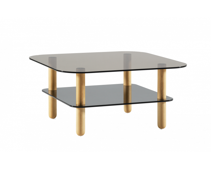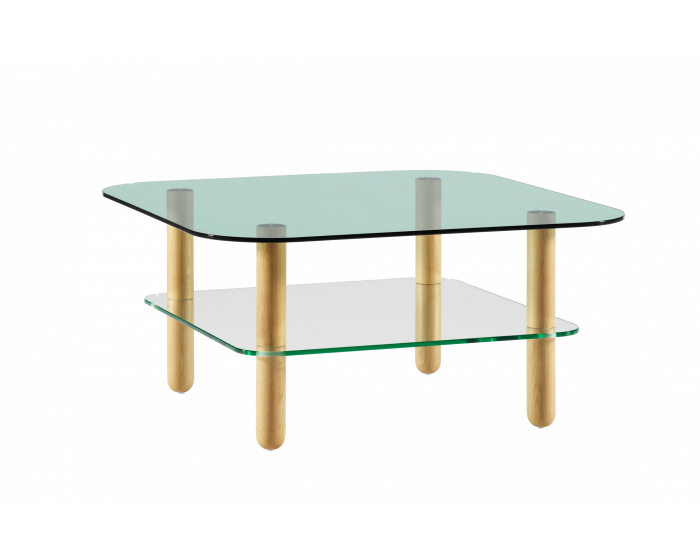 Столешница и полка из закаленного стекла на толстых дубовых ножках, поставляются в разложенном виде в упаковке для сборки покупателю. Выбирайте разные цвета стеклянных секций: прозрачные, синие, зеленые и коричневые. Ноги доступны в трех стандартных цветах.