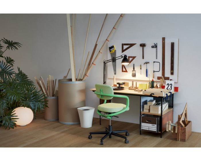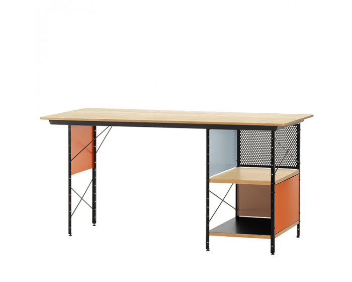 Стол Eames Desk Unit (EDU) от Vitra состоит из фанерной столешницы и черной стальной рамы с порошковым покрытием, которая привлекает внимание своей тонкой поперечной конструкцией. Яркие панели придают столу игривый вид и частично закрывают два отделения для хранения вещей. Металлические ножки можно индивидуально отрегулировать для неровностей пола.