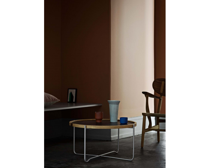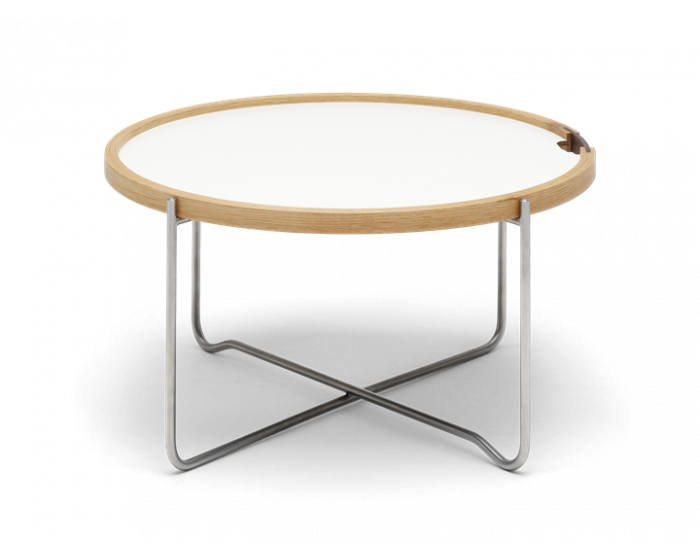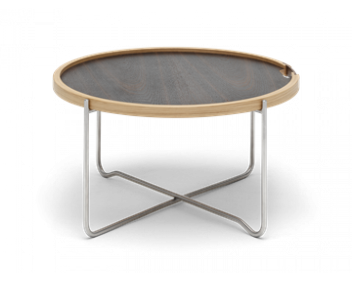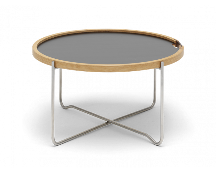 Столик подноса CH417 Ханса Дж. Вегнера объединяет две простые части - двусторонний круглый поднос и складное основание из нержавеющей стали - в интеллектуальное и удобное для хранения решение, которое одновременно является простым и практичным. Световой поднос имеет дубовый ободок натурального цвета, который доступен в версии с черным ламинатом с одной стороны и белым с другой стороны или со светлым и дымчатым шпоном с обеих сторон. Ободок подноса изготовлен из фасонного шпона светлого дуба, который удерживается узкой полоской из дымчатого дуба. Эта узкая деталь не только закрывает лоток, но и действует как ручка, как паз в лотке, что облегчает удержание лотка при переноске.