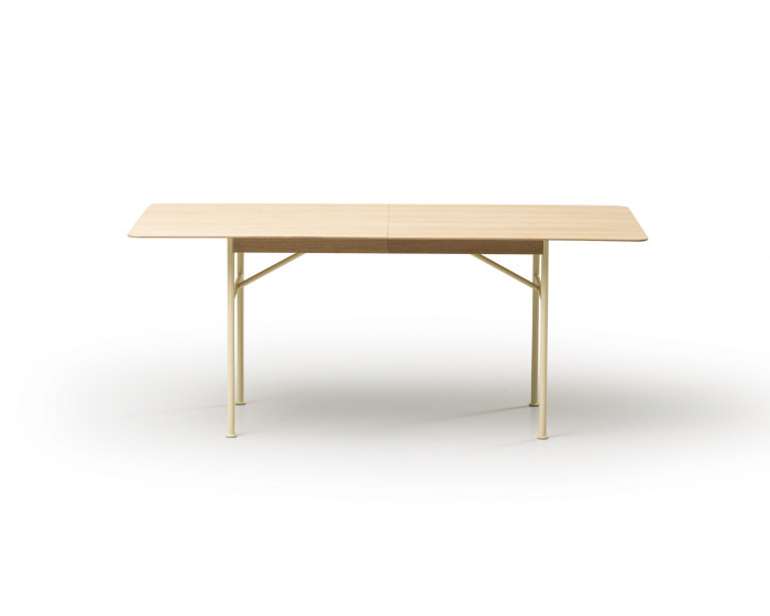 Ножки из металла. Столешница из МДФ со шпоном дуба и скошенной массивной клееной древесиной. Каркас из массива дерева, выдвижной механизм из металла. Удлинитель оставляет 50 или 100 см, максимальная длина - 280 см.