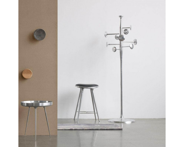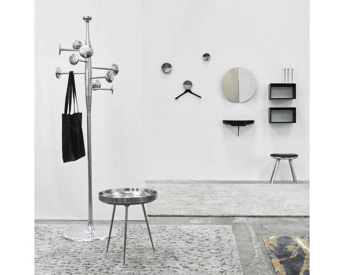 Mater Trumpet Coat Stand - это современный скульптурный образец, созданный датским архитектором дуэтом Space Copenhagen. Девять дисков трех разных размеров установлены на подставке и расположены под углами, подходящими для подвешивания шляп, шарфов и зонтов. Труба изготовлена по старинному методу литья песка в небольшой мастерской в Северной Индии.